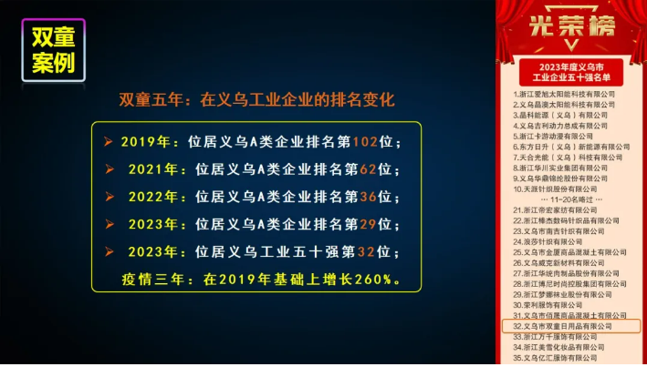2023年,平臺整體增長(cháng)35.24%;平臺稅收增長(cháng)23.30%,成功登榜“納稅千萬(wàn)元以上工業(yè)企業(yè)”和“義烏市工業(yè)企業(yè)五十強”!