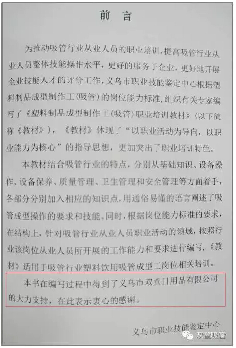 近期,由“雙童”代表行業(yè)編制的義烏市職業(yè)技能培訓教材《吸管成型工培訓教材》正式面世!這本書(shū)將作為吸管行業(yè)塑料飲用吸管成型工崗位的培訓教材,以后吸管成型工將可以有國家資質(zhì)認定了,對整個(gè)吸管行業(yè)來(lái)說(shuō)都是一次技能與操作上的統一提升。