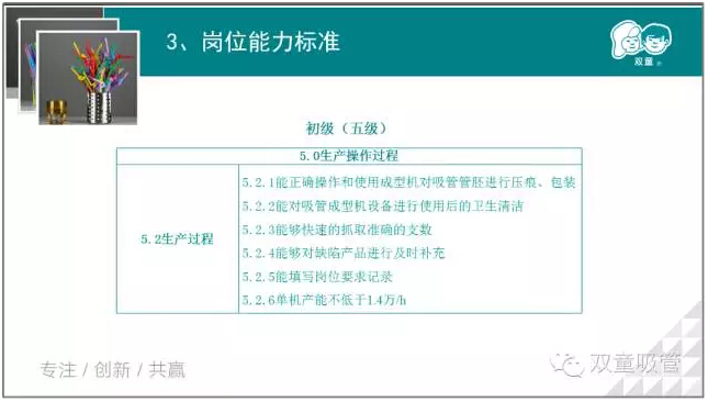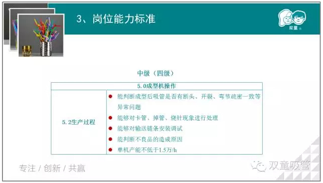 接下來(lái),我們將根據吸管成型工的標準體系,對吸管成型工崗位的初級、中級、高級等五個(gè)等級進(jìn)行劃分,鼓勵員工們進(jìn)行報考職業(yè)等級證書(shū),提升自我!