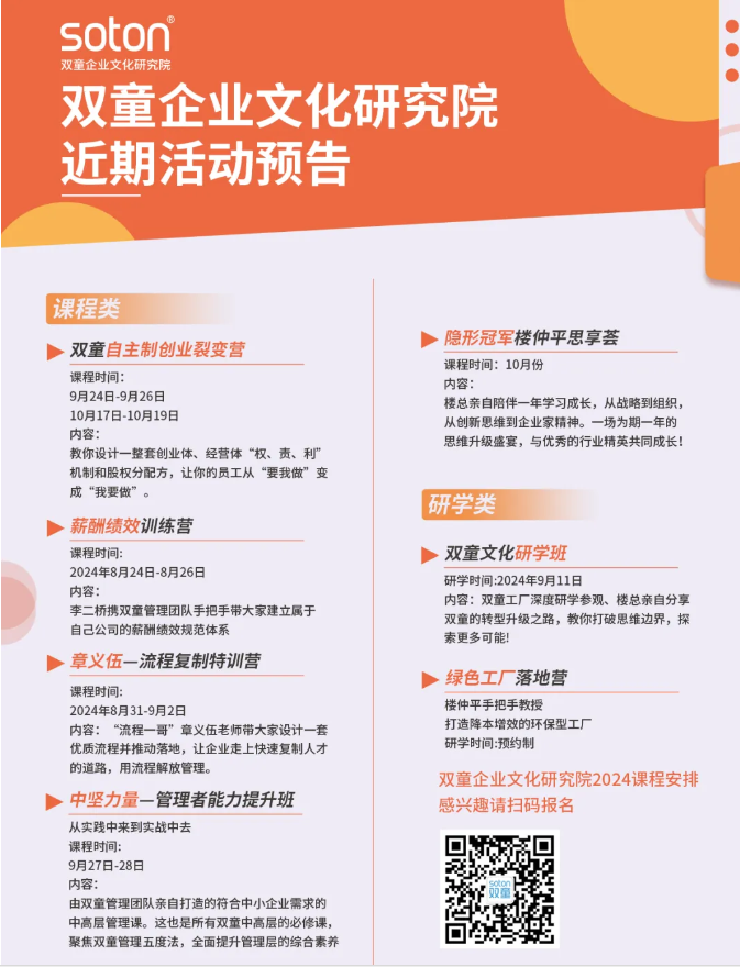 如果你也對“雙童”充滿(mǎn)好奇,也想賦能團隊共同成長(cháng),歡迎走進(jìn)9月11日【雙童文化研學(xué)班】,與上百位優(yōu)秀的創(chuàng )業(yè)者一起學(xué)習!少量名額,歡迎咨詢(xún)鎖定!