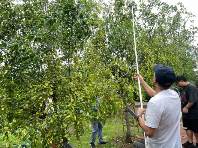 如果你也想重回一下兒時(shí)的時(shí)光,不妨9月11日,來(lái)“雙童”試試,很有趣哦~去年跟著(zhù)老板打棗的情景歷歷在目,為了能將棗子裝滿(mǎn)自己的小籃子,用手搖、用竹竿敲、爬梯子摘、在樹(shù)下?lián)炻蠹摇案黠@神通”!▲ 為了打到棗子,各顯神通