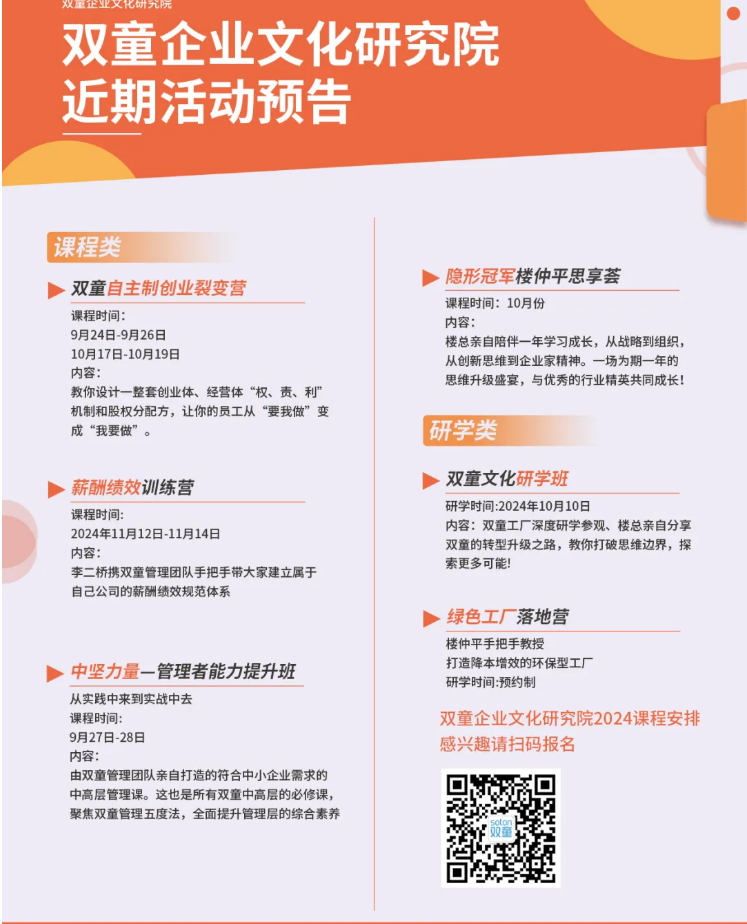 該課程將用一天的時(shí)間,帶領(lǐng)大家實(shí)地探索中國吸管博物館、“雙童”網(wǎng)紅餐廳、節能降耗系統、百米文化長(cháng)廊、空中生態(tài)花園......除了現場(chǎng)課堂,還有創(chuàng )始人樓仲平3個(gè)小時(shí)的主題課程分享,讓學(xué)員親身感受“雙童”的經(jīng)營(yíng)哲學(xué)!