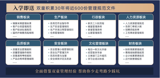 所以,入學(xué)“隱形冠軍樓仲平思享薈”之后,項目組會(huì )將“雙童”積累了30年、包含了銷(xiāo)售、生產(chǎn)、行政、人類(lèi)資源、品質(zhì)、安全和文化管理7大板塊,將近600分管理規范文件,全部打包給學(xué)員,幫助學(xué)員企業(yè)能夠全面借鑒雙童管理經(jīng)驗、少走彎路、少踩坑!