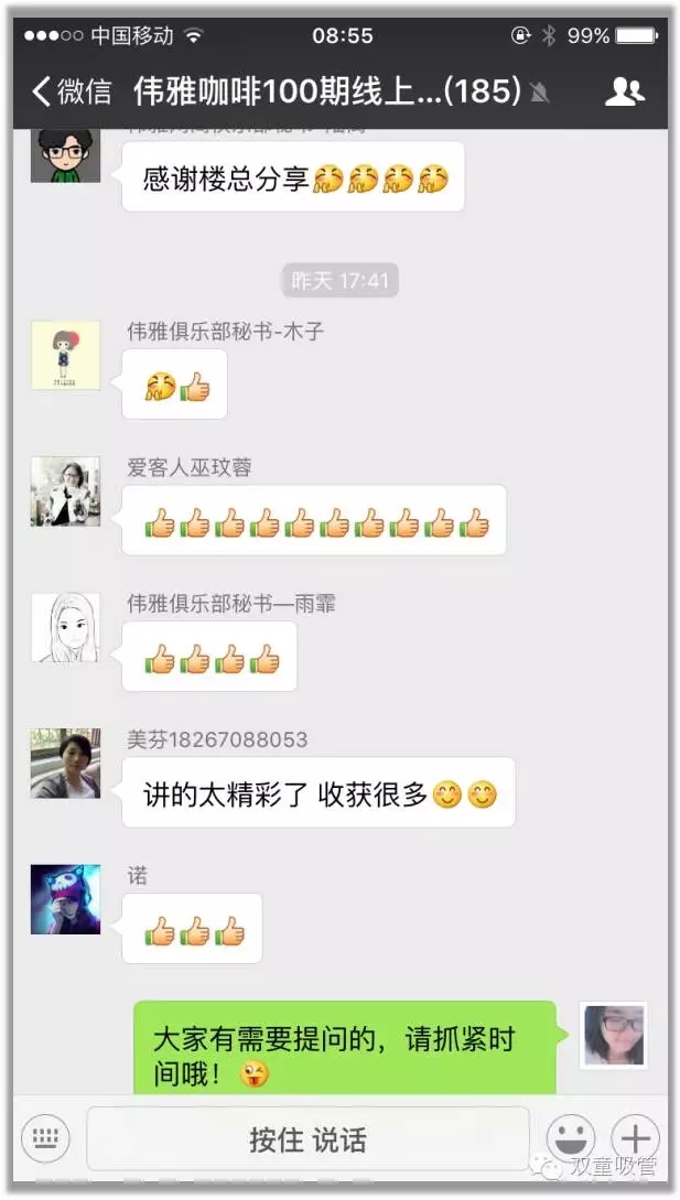 7月27日下午,吸管妞早在微信上預告過(guò)的上海偉雅網(wǎng)商俱樂(lè )部如期開(kāi)始了偉雅咖啡線(xiàn)上沙龍!當家人樓總首次在微信上進(jìn)行線(xiàn)上直播課程,與近200號管理精英分享《雙童”是如何“講故事”的》課程,效果到底如何?我們趕緊來(lái)回顧一下!