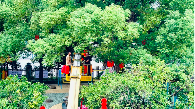 廠(chǎng)區工作人員正在為“雙童”一號樹(shù)掛燈籠