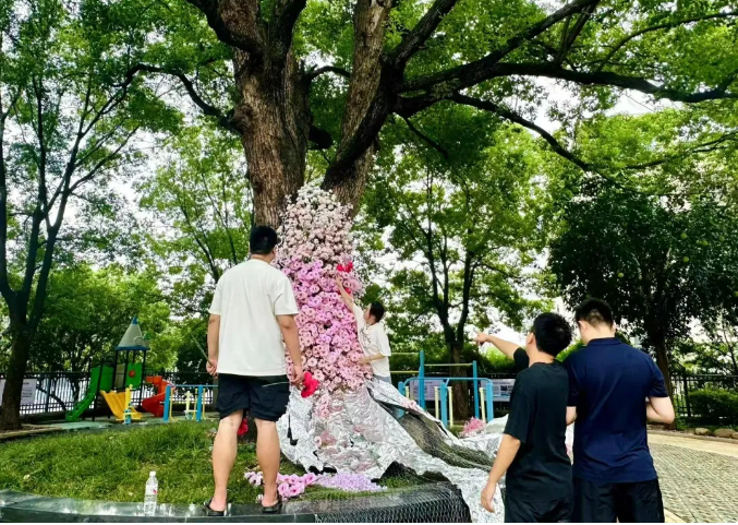 不僅高聳入云的“雙童一號樹(shù)”被裝點(diǎn)得如詩(shī)如畫(huà),就連它腳下的每一寸土地也未能幸免于這場(chǎng)裝飾盛宴。是的你沒(méi)看錯,一號樹(shù)下四位工作人員親自動(dòng)手、群策群力、加班加點(diǎn),將一朵朵花插入一號樹(shù)下打造出了一面唯美的花墻!