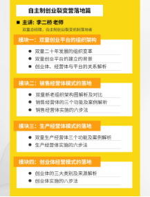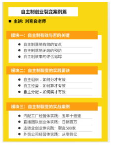 《自主制創(chuàng )業(yè)裂變營(yíng)》是一個(gè)超實(shí)用主義的課程,采用理論+實(shí)踐+案例相結合的方式,讓學(xué)員能夠在3天2夜的學(xué)習中,能夠自主設計一套完整的落地方案!