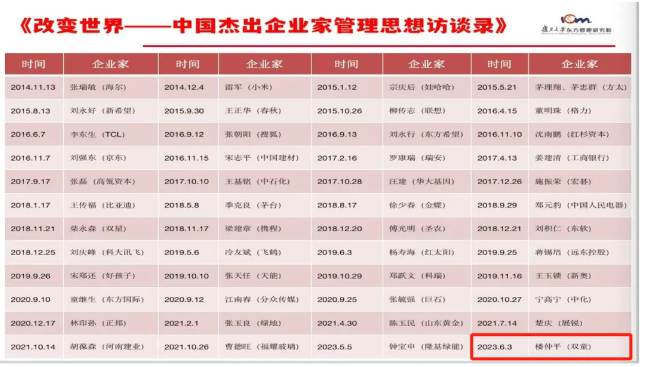 自2014年《改變世界》項目啟動(dòng),上海第一財經(jīng)頻道還同步推出了同名系列專(zhuān)題片訪(fǎng)談,近10年時(shí)間共采訪(fǎng)了50位中國各行各業(yè)影響力頗深的企業(yè)家,通過(guò)深度訪(fǎng)談,薈聚中國式管理的思想精粹,向世界管理論壇傳遞中國的聲音!