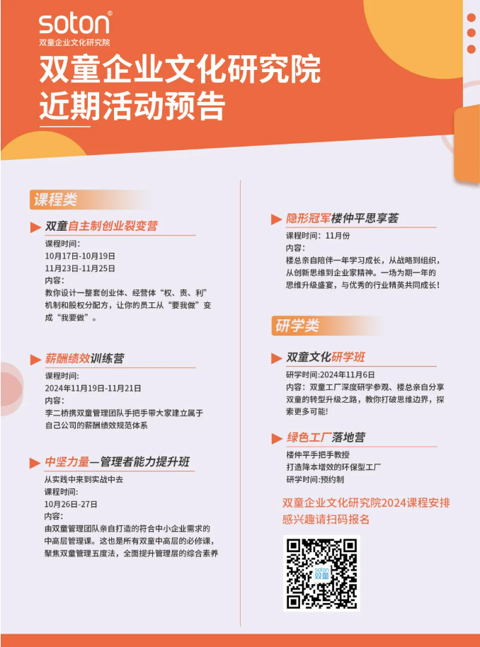 從樓總的分享中,我們能清晰地感知到,他一直在尋求破界、創(chuàng )新,每當企業(yè)趨于穩定時(shí),他就會(huì )扮演“攪局者”的角色,打破現有的平衡。也正是創(chuàng )始人這種“于無(wú)聲處聽(tīng)驚雷”的未雨綢繆,才能讓雙童在每次危機來(lái)臨時(shí),都能成功“闖關(guān)”,穿越一個(gè)個(gè)成長(cháng)周期!
