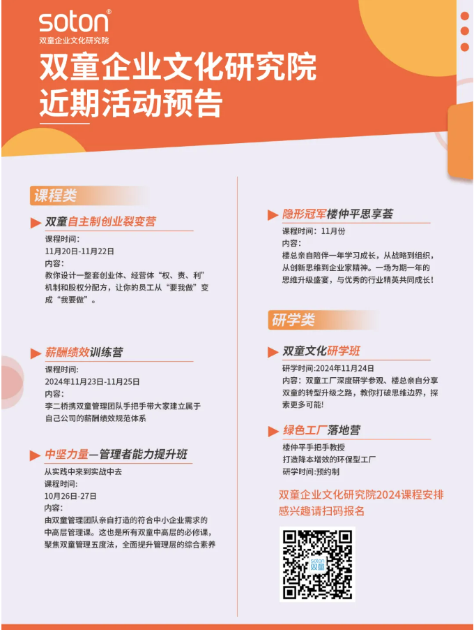 雙童商學(xué)院將通過(guò)本次展會(huì ),向更多中小企業(yè)傳播雙童的文化、經(jīng)營(yíng)理念,讓更多人認識這個(gè)實(shí)戰類(lèi)創(chuàng )業(yè)教育培訓的商學(xué)院。