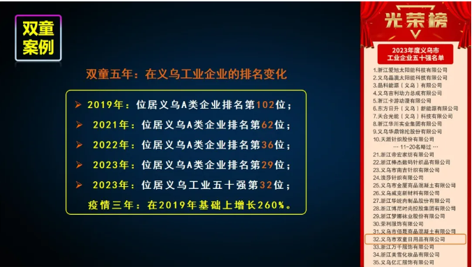 通過(guò)該機制,雙童已經(jīng)形成了以吸管制造業(yè)為基礎,以國際貿易和創(chuàng )業(yè)教育兩大板塊為融合的新的產(chǎn)業(yè)模式,做到了輕重結合、虛擬結合,不僅讓雙童業(yè)績(jì)實(shí)現連年攀升,增強了企業(yè)的活力和反脆弱性,同時(shí)實(shí)現了企業(yè)和員工的共同富裕!