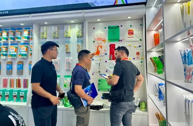 然而,“雙童”的足跡已不再局限于單一的吸管領(lǐng)域。本次義博會(huì )還帶來(lái)了“雙童”的可降解膜袋、創(chuàng )新吸管、塑料口杯、PE手套及垃圾袋等一系列環(huán)保產(chǎn)品。