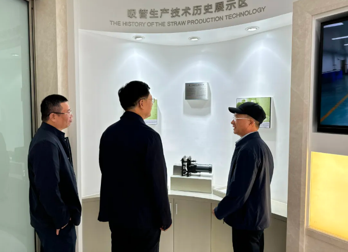 創(chuàng )始人樓仲平為領(lǐng)導們介紹“雙童”的吸管標準文件