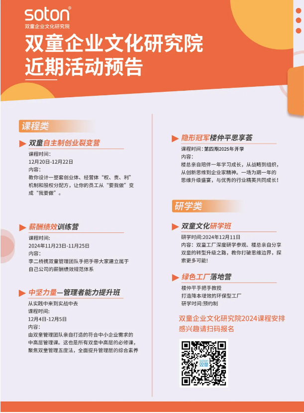 個(gè)體的進(jìn)化是組織進(jìn)化的前提,創(chuàng )業(yè)者的“成長(cháng)活性”驅動(dòng)著(zhù)企業(yè)的“成長(cháng)活性”。所以樓仲平個(gè)人的持續進(jìn)化,也推動(dòng)了雙童這家企業(yè)在30年間,不斷穿越一個(gè)個(gè)經(jīng)營(yíng)周期,并持續充滿(mǎn)活力!