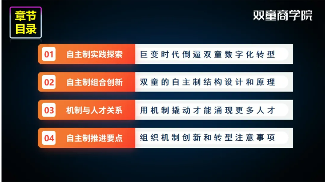 其次,在3位負責課程交付的老師中,樓仲平老師是該機制的首創(chuàng )者,李二橋老師是把自主制創(chuàng )業(yè)裂變機制落地在雙童的實(shí)操者,劉育良老師也擁有豐富的實(shí)踐經(jīng)驗,所以更能確保“從實(shí)踐中來(lái)、到實(shí)戰中去”,能切實(shí)幫助學(xué)員輸出一套企業(yè)組織創(chuàng )新方案,激發(fā)個(gè)體活力,推動(dòng)企業(yè)裂變式增長(cháng)。