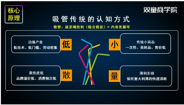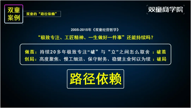 2015年,雙童發(fā)展正如日中天,但創(chuàng )始人樓仲平已經(jīng)隱隱意識到雙童已經(jīng)來(lái)到了新的極限點(diǎn)。樓老師還現場(chǎng)播放了一段大約十年前央視《新聞聯(lián)播》報道雙童的視頻,向大家展示了雙童在吸管行業(yè)的領(lǐng)先地位。但也就是在這段時(shí)期,雙童遇到了行業(yè)“天花板”,創(chuàng )新紅利已經(jīng)開(kāi)始衰竭,國際禁塑也讓吸管的應用場(chǎng)景在大幅減小,行業(yè)越來(lái)越內卷!《雙童經(jīng)營(yíng)哲學(xué)》(2015版)中倡導的“極致專(zhuān)注、工匠精神、一生做好一件事”不可持續!