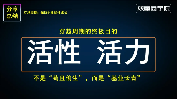 但是,如果已經(jīng)意識到周期,卻無(wú)動(dòng)于衷的話(huà),其穿越周期的難度會(huì )越來(lái)越高,最后極有可能被周期所限(老化、死亡)。所以在分享的最后,樓老師也鼓勵現場(chǎng)年輕的企業(yè)家們,一定要對“周期”予以重視并積極應對,讓自己的企業(yè)不是“茍且偷生”,而是有尊嚴,有活性,有活力,“基業(yè)長(cháng)青”的活著(zhù)!