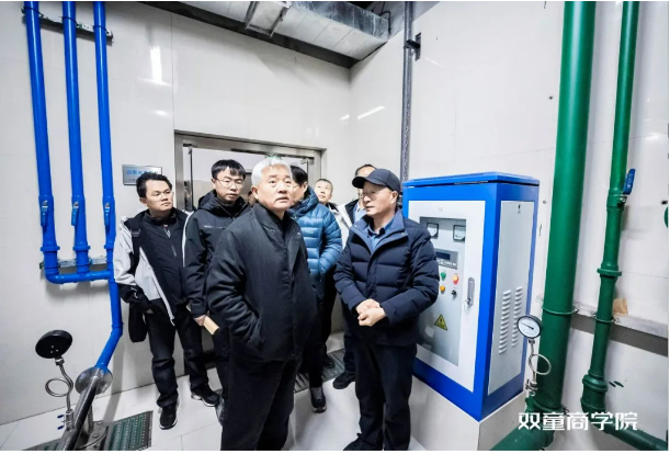 為了讓大家弄清楚各個(gè)系統的運行原理,創(chuàng )始人樓仲平首先陪同張維迎教授和辛莊課堂同學(xué)們來(lái)到“一號樹(shù)”下,了解廢水處理中水回用系統。這套系統可以將員工生活廢水的70%進(jìn)行二次利用,每年能幫雙童節省近50萬(wàn)元的水費。