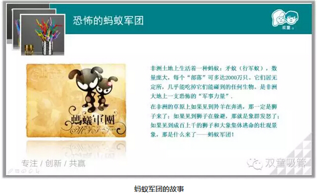 游戲結束,課程也正式開(kāi)始啦!妞通過(guò)兩個(gè)小故事和我們分享了團隊精神,在非洲的大地上有一支恐怖的“軍事力量”——螞蟻軍團!成百上千的獅子和大象見(jiàn)到他們就會(huì )集體逃命,他們經(jīng)過(guò)的地方會(huì )寸草不生。一只螞蟻的力量很小,可成千上萬(wàn)只螞蟻的力量卻是無(wú)窮大呀!