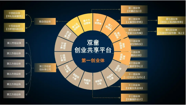 隨后,“雙童”涌現出一批又一批年輕有活力的員工開(kāi)啟了內部創(chuàng )業(yè)的熱潮,也由此逐漸延伸出了外貿、文創(chuàng )、文化傳媒、創(chuàng )業(yè)教育培訓、財務(wù)咨詢(xún)等多個(gè)板塊!在雙童30周年盛典,“雙童”又誕生了一批創(chuàng )業(yè)體,至今已孵化出26個(gè)板塊的自主經(jīng)營(yíng)體,16家創(chuàng )業(yè)體。