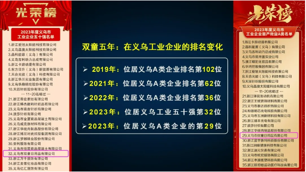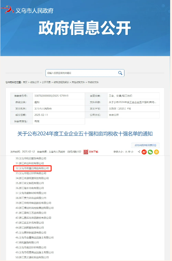 2月12日,義烏市人民政府網(wǎng)公布了“2024年度工業(yè)企業(yè)50強”名單,雙童創(chuàng )業(yè)共享平臺第一創(chuàng )業(yè)體(雙童日用品有限公司)與2023年蟬聯(lián)同榜同序,位居第32位!