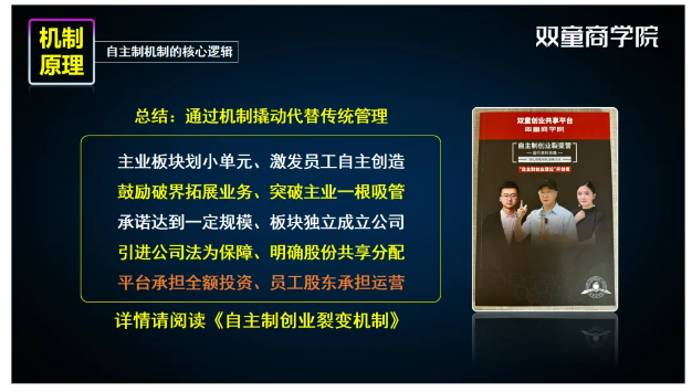 為了助力更多中小企業(yè)也能運用這套機制實(shí)現快速增長(cháng),早在2022年,雙童商學(xué)院就針對該機制打磨成《自主創(chuàng )業(yè)裂變營(yíng)》課程。