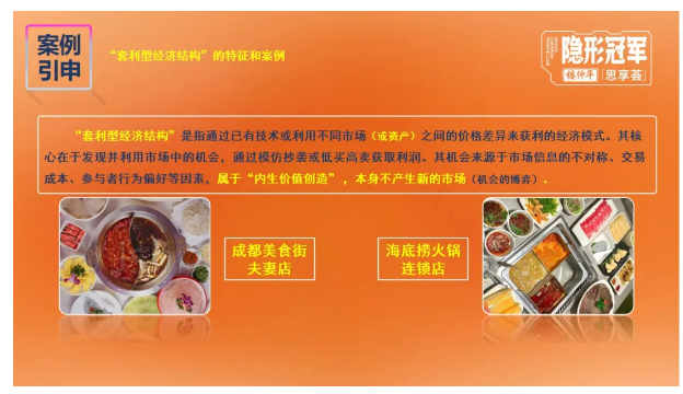 比如樓老師在課上提到的經(jīng)典案例:開(kāi)在成都街頭的夫妻火鍋店只是在瓜分原有的市場(chǎng)資源,并沒(méi)有創(chuàng )造出新的消費需求,所以屬于“套利型經(jīng)濟結構”;而同樣是火鍋,海底撈通過(guò)創(chuàng )新研究,開(kāi)發(fā)出了新的市場(chǎng)和客戶(hù)群體,所以屬于“創(chuàng )新型經(jīng)濟結構”。