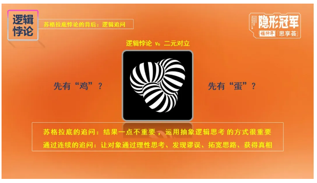 課程一開(kāi)始,樓老師先引入了非常經(jīng)典的“蘇格拉底悖論”,通過(guò)對“先有雞還是先有蛋“的不斷追問(wèn),讓同學(xué)們明白這個(gè)問(wèn)題本身就是悖論,沒(méi)有答案,答案也一點(diǎn)不重要,重要是思考過(guò)程,是大家在層層追問(wèn)中呈現的思維發(fā)散和運用抽象邏輯思考的方式。