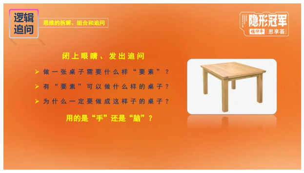 通過(guò)訓練,同學(xué)們會(huì )驚喜的發(fā)現,當自己“突破眼睛”,對構成“桌子”的要素無(wú)限拆解再重新?lián)駜?yōu)組合時(shí),會(huì )得到無(wú)數多個(gè)形態(tài)各異的“新產(chǎn)品”。這些“新產(chǎn)品”,雖然不是從0到1的產(chǎn)物,但卻在原有產(chǎn)品的基礎上獲得了新機會(huì ),撬動(dòng)了客戶(hù)新的需求,獲得了新的市場(chǎng)。