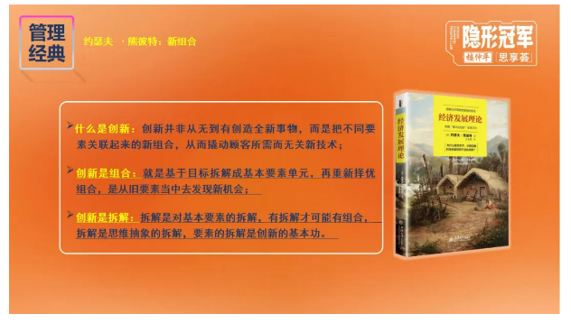 而實(shí)現創(chuàng )新的工具則是對要素的拆解和重新組合。其中,要素的拆解是創(chuàng )新的基本功,有拆解才可能有組合;組合是基于目標拆解成基本要素單元,再重新?lián)駜?yōu)組合,是從舊要素當中去發(fā)現新機會(huì )。樓老師將“0—1”的創(chuàng )新和對基本要素的拆解和組合,這三種創(chuàng )新工具巧妙地概括為“無(wú)中生有”、“推陳出新”和“移花接木”。