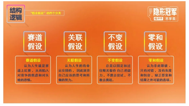 圍繞商業(yè)當中的常見(jiàn)隱含假設,大概可以分為4類(lèi):賽道假設、關(guān)聯(lián)假設、不變假設及零和假設,如果不對這些“隱含假設”進(jìn)行破除和挖掘,創(chuàng )業(yè)者就很難打破自己的認知邊界,而認知以外的錢(qián)你是掙不到的!