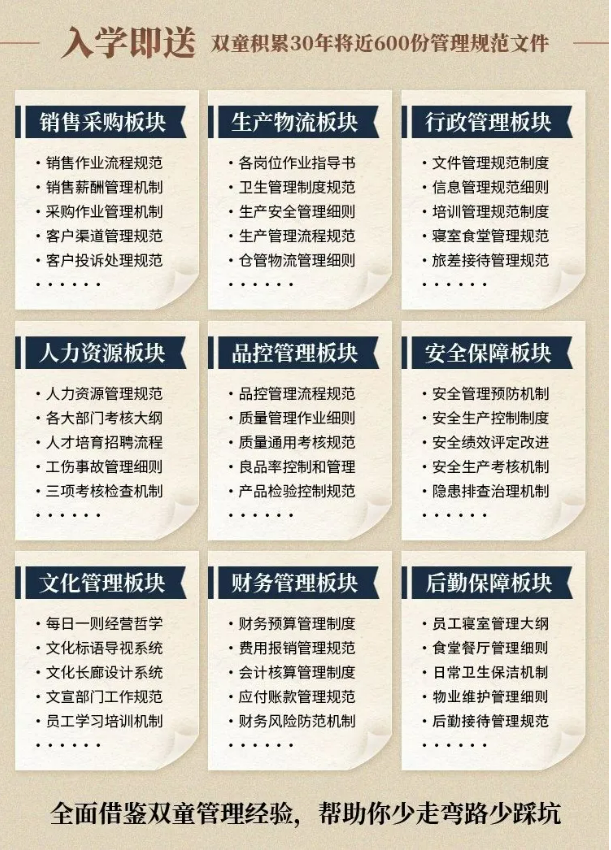 所以,入學(xué)“隱形冠軍樓仲平思享薈”之后,項目組會(huì )將“雙童”積累了31年、包含了銷(xiāo)售、生產(chǎn)、行政、人力資源、品質(zhì)、安全、文化管理、財務(wù)和后勤等9大板塊,600份管理規范文件,全部打包給學(xué)員,幫助學(xué)員企業(yè)能夠全面借鑒雙童管理經(jīng)驗、少走彎路、少踩坑!