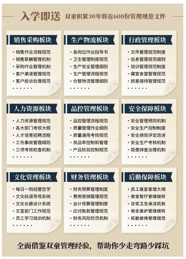 所以,入學(xué)“隱形冠軍樓仲平思享薈”之后,項目組會(huì )將“雙童”積累了31年、包含了銷(xiāo)售、生產(chǎn)、行政、人力資源、品控、安全、文化管理、財務(wù)和后勤等9大板塊,近600份管理規范文件,全部打包給學(xué)員,幫助學(xué)員企業(yè)能夠全面借鑒雙童管理經(jīng)驗、少走彎路、少踩坑!