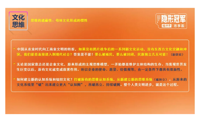 其實(shí)無(wú)論是國家意志還是企業(yè)文化,原來(lái)形成的主觀(guān)思維模型,一開(kāi)始都是維護主體結構的生存,當客觀(guān)世界發(fā)生巨變以后,原有文化就變成戕害作用。所以樓老師特別提醒創(chuàng )業(yè)者們,企業(yè)的使命、愿景、價(jià)值觀(guān)等,在一定條件下都具有雙面性,一定要警惕原有文化的遮蔽性。