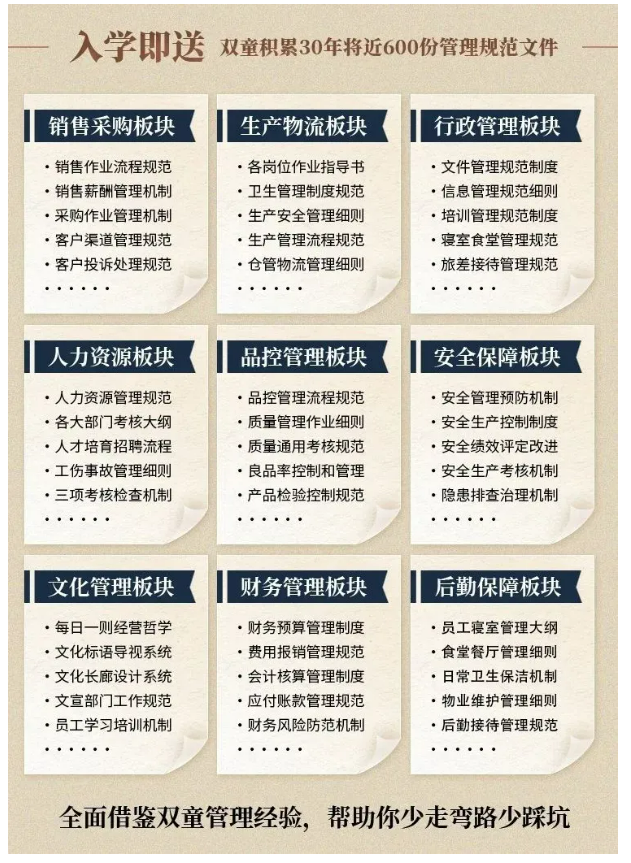 所以,入學(xué)“隱形冠軍樓仲平思享薈”之后,項目組會(huì )將“雙童”積累了31年、包含了銷(xiāo)售、生產(chǎn)、行政、人力資源、品控、安全、文化管理、財務(wù)和后勤等9大板塊,近600份管理規范文件,全部打包給學(xué)員,幫助學(xué)員企業(yè)能夠全面借鑒雙童管理經(jīng)驗、少走彎路、少踩坑!