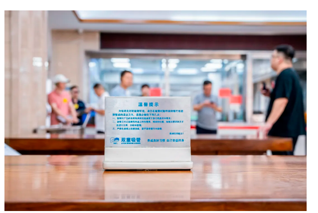 在每張餐桌上都擺放著(zhù)用餐規范的標語(yǔ)提示牌,指引大家如何在就餐時(shí)保持衛生整潔,以及如何在餐后有序進(jìn)行垃圾分類(lèi)。