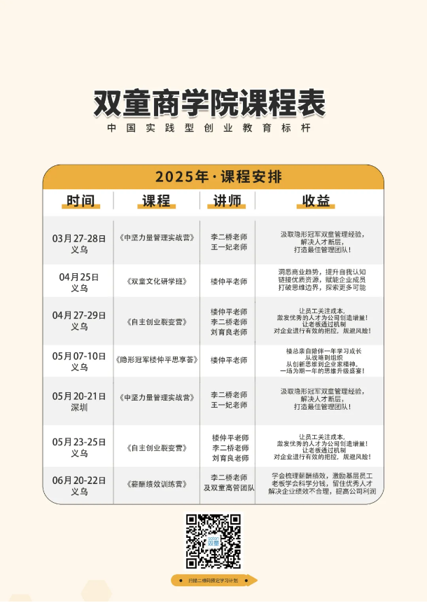 當然,除了現場(chǎng)課堂,還有創(chuàng )始人樓仲平老師的主題課程分享,更有分享結束后,還將以問(wèn)答互動(dòng)的形式為學(xué)員們解答參觀(guān)過(guò)程中疑惑、或者企業(yè)發(fā)展中遇到的問(wèn)題,讓大家在研學(xué)活動(dòng)中避免走馬觀(guān)花,真正找到“雙童”經(jīng)營(yíng)過(guò)程中的科學(xué)管理邏輯,實(shí)現創(chuàng )業(yè)思維的升階!