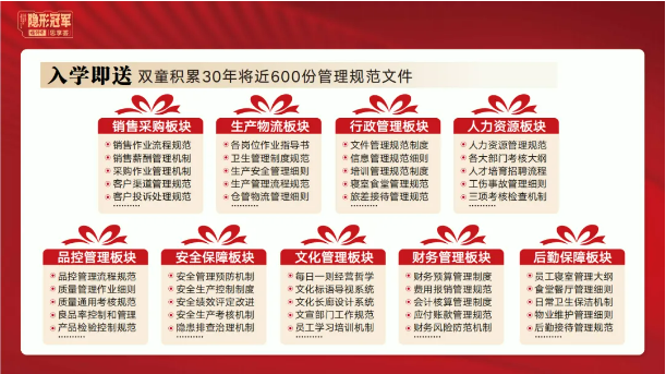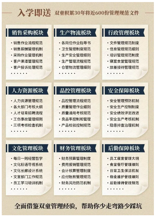 所以,入學(xué)“隱形冠軍樓仲平思享薈”之后,項目組會(huì )將“雙童”積累了31年的近600份管理規范文件,其中包含了銷(xiāo)售、生產(chǎn)、行政、人力資源、品控、安全、文化管理、財務(wù)和后勤等9大板塊,全部打包給學(xué)員,幫助學(xué)員企業(yè)能夠全面借鑒雙童管理經(jīng)驗、少走彎路、少踩坑!
