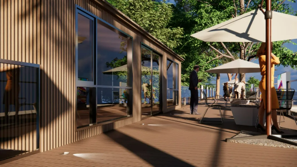 結合周?chē)臉?shù)林環(huán)境,雙童森林長(cháng)廊的主體采用了木質(zhì)材料;而考慮到現在年輕人的喜好,又在樹(shù)屋里設計了咖啡屋和燒烤區。