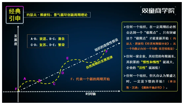 任何一個(gè)組織,在一定周期后必然會(huì )達到一個(gè)“極限點(diǎn)”,只有突破這個(gè)“極限點(diǎn)”才能重新開(kāi)始。同時(shí),一家企業(yè)經(jīng)營(yíng)的年限越長(cháng),其積累的“慣性和惰性”就越大,企業(yè)的“活性”就越低,所以想要突破“極限點(diǎn)”,就需要“破界創(chuàng )新”!