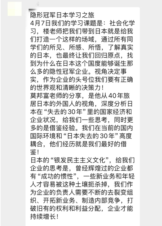 浜野制作所是小而美的企業(yè)典范,屬于日本隱形冠軍企業(yè)的代表。它的成功轉型,展示了日本企業(yè)在面對經(jīng)濟挑戰時(shí)的適應力和創(chuàng )新能力,這也正是同學(xué)們當下面對相似的國內經(jīng)營(yíng)環(huán)境,需要向標桿企業(yè)學(xué)習并掌握的關(guān)鍵點(diǎn)。而浜野先生身上所具備的工匠精神和向死而生的企業(yè)家精神同樣值得我們深入學(xué)習!