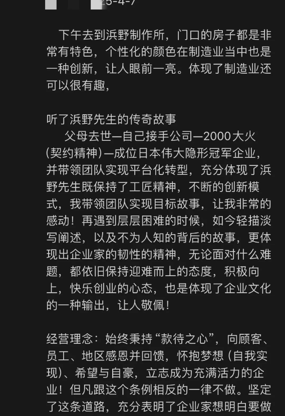所以浜野慶一會(huì )長(cháng)特別提出了這樣的經(jīng)營(yíng)理念:“常懷 ‘款待之心’,感恩回報顧客、員工和當地,成為一家有夢(mèng)想,有自我,有前途,打造充滿(mǎn)自豪感與活力的企業(yè)!”。