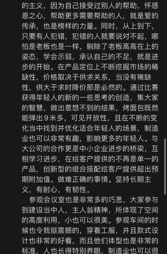 所以,在第一天的研學(xué)結束之后,同學(xué)們不僅收獲了很多關(guān)于精細化管理等企業(yè)經(jīng)營(yíng)的新靈感,對自身企業(yè)未來(lái)的經(jīng)營(yíng)方向也有了新的思考與感悟: