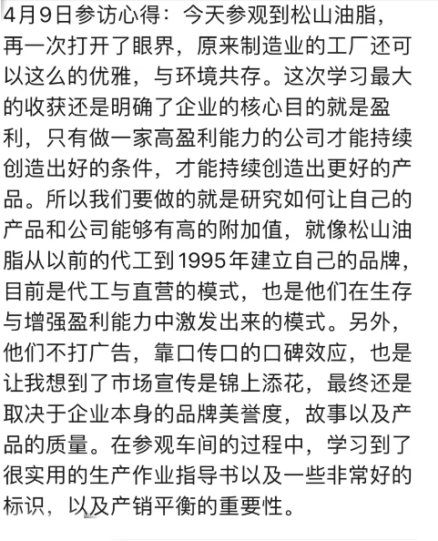 這次參觀(guān)松山油脂的富士山工廠(chǎng),也讓同學(xué)們深刻體會(huì )到了松山油脂對產(chǎn)品制造的嚴謹態(tài)度,同時(shí)更加深入了解日本傳統日化制造業(yè)的發(fā)展和現代管理,學(xué)習如何在堅守傳統的同時(shí),實(shí)現品牌化與市場(chǎng)化發(fā)展。