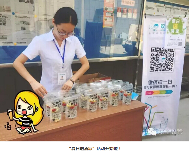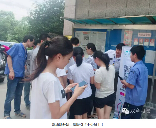 瞧!我們剛開(kāi)張,就吸引了不少正要去吃飯的員工們。原來(lái),拿到飲料的方法特別簡(jiǎn)單,只需要關(guān)注“雙童吸管”的微信公眾平臺并轉發(fā)微信,即可獲得檸檬氣泡水一袋呢!看來(lái)吸管妞為了微信的推廣也是絞盡腦汁啦!
