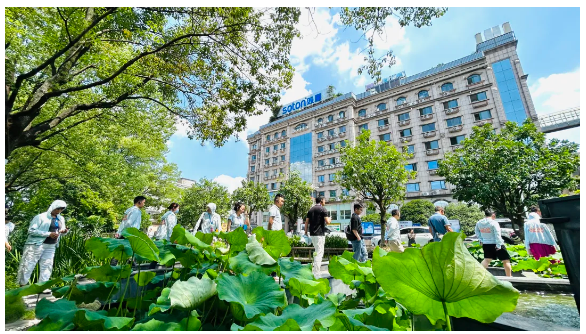 夏天的傍晚,員工們三兩成群漫步橋畔,沉醉荷池美景。聽(tīng)瀑布潺潺,看斜陽(yáng)映水,魚(yú)兒游弋,簡(jiǎn)直美得像一幅畫(huà)~