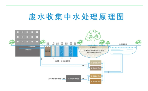 所謂“廢水收集處理循環(huán)回用系統”,就是將員工的生活廢水過(guò)濾后匯聚到“ 雙童一號樹(shù)”下進(jìn)行生物吸附處理,形成中水,然后再流入景觀(guān)池下的中水儲存池中,以便供給廠(chǎng)區所有衛生間的馬桶沖水、綠化噴淋和道路清洗、車(chē)輛清洗所用。