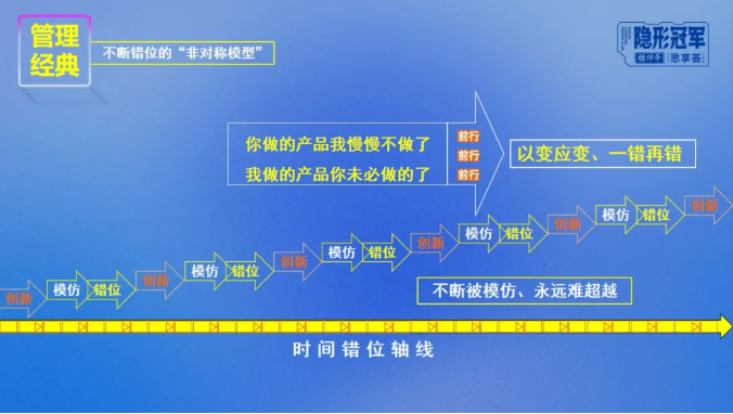 正如在商業(yè)競爭中,一個(gè)新產(chǎn)品誕生馬上會(huì )被模仿一樣,任何一種有價(jià)值的戰略定位,也都會(huì )引起他人的“爭相效仿”。所以,樓老師提醒同學(xué)們,再好的競爭策略也需要在發(fā)展過(guò)程中,不斷錯位:與主流錯位、與同行錯位、與自己錯位、與時(shí)間錯位、“一錯再錯”,始終在他人模仿前創(chuàng )新迭代,向前向前,企業(yè)才能持續領(lǐng)先!巨變時(shí)代下,“保持不變”是最大的敵人!