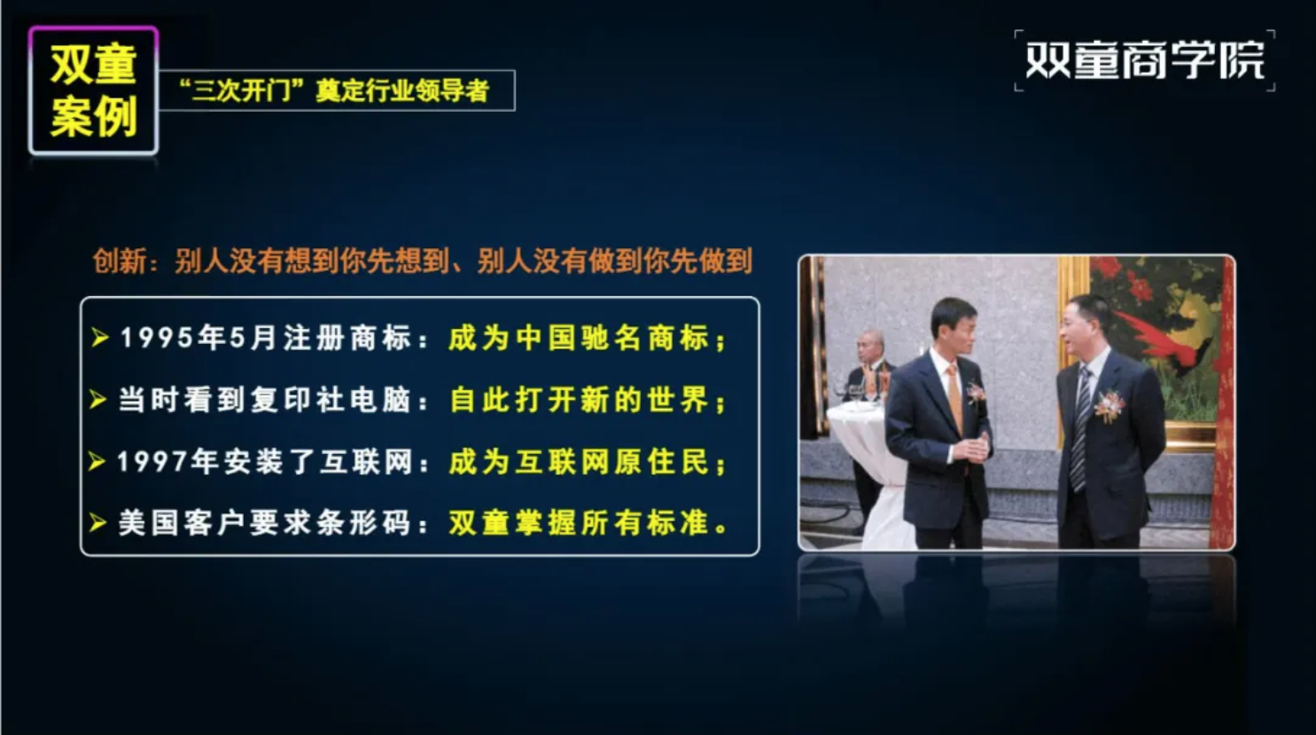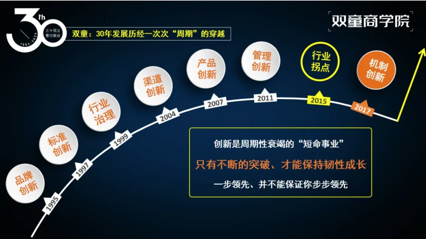 企業(yè)成長(cháng)的背后是創(chuàng )業(yè)者的持續成長(cháng),“雙童”能夠一次次成功穿越周期的背后,是創(chuàng )始人樓仲平個(gè)人的持續成長(cháng)、自我進(jìn)化的結果!也是創(chuàng )始人樓仲平47年如一日踐行"行知合一"的原因。所以在每一場(chǎng)分享中,他都將自己從草根創(chuàng )業(yè)者到行業(yè)領(lǐng)袖的進(jìn)化歷程作為開(kāi)篇,因為這正是“雙童”韌性成長(cháng)的核心密碼。