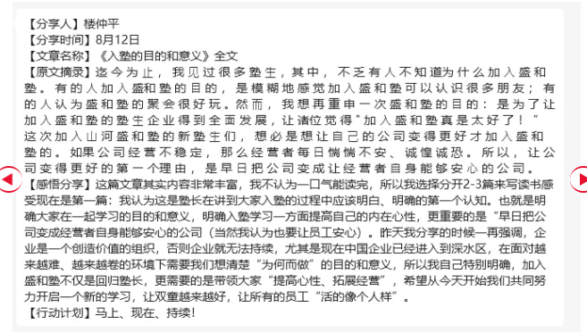 所以雙童進(jìn)入盛和塾不僅僅拿著(zhù)塾長(cháng)的書(shū)閱讀那么簡(jiǎn)單,也不是開(kāi)幾次空吧聚聚餐、吃吃飯、高興高興那么簡(jiǎn)單!雙童加入盛和塾是要洗心革面的!